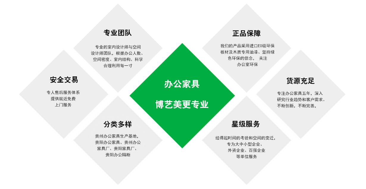 貴州博藝美辦公家具有限公司是一家集辦公家具定制、方案設計、制造銷售為主的貴陽辦公家具廠家,公司致力于為客戶提供品牌配套辦公家具,幫助客戶創造舒適的辦公環境,適中的價位方案。產品范圍包括:老板桌、經理桌、職員桌、會議桌、文件柜、玻璃隔斷、辦公沙發、酒店家具、學校課桌家具、培訓桌、辦公椅、洽談桌等定制類家具。凝結藝術之美,張揚人性化辦公環境,詮釋優質辦公家具之精髓,努力為客戶營造舒適典雅的現代辦公環境。致力于打造貴州辦公家具廠家第一品牌,為提升整體辦公環境而努力!